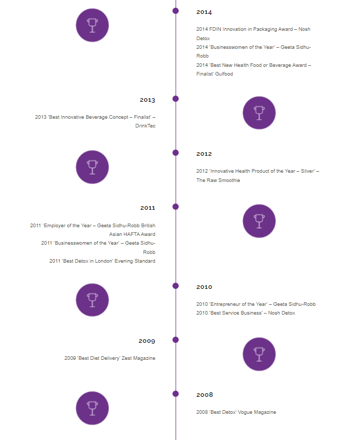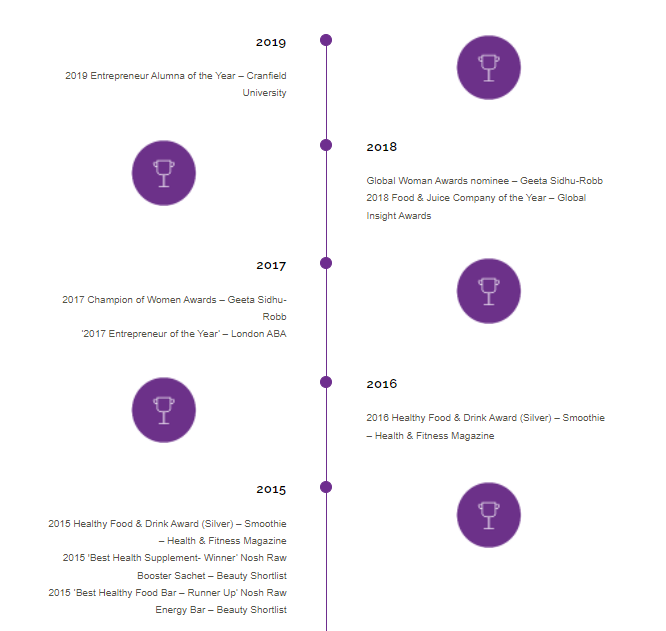 Geeta took home Entrepreneur and Business Women of the Year awards in 2010, 2011, 2014 and 2017, Champion of Women award in 2017 and Entrepreneur Alumna of the Year 2019 along with 13 other awards for her business. Her strong skills in business development and entrepreneurial acumen have seen Nosh grow from a start-up to a multi-award-winning wellness empire.